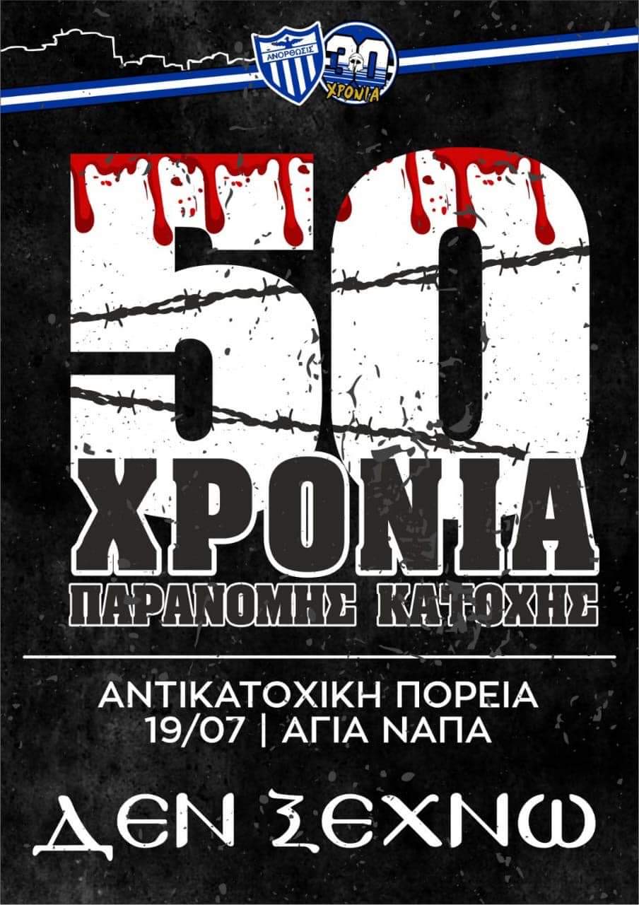 Στεκόμαστε όρθιοι σε ένα κόσμο ερειπίων και βροντοφωνάζουμε πως ΔΕΝ ΞΕΧΝΟΥΜΕ.Όπως κάθε χρονιά έτσι και φέτος, δίνουμε το αντικατοχικό μήνυμα προς πάσα κατεύθυνση μέσω μιας αντικατοχικής πορείας η οποία θα λάβει χώρα στην Αγία Νάπα την Παρασκευή 19 Ιουλίου. Θα δίνονται ενημερωτικά φυλλάδια καθόλη την διάρκεια της πορείας ως προς διαφώτιση επί του θέματος.