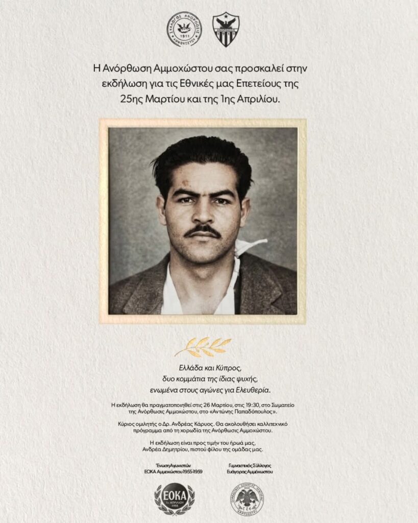 Η εκδήλωση θα πραγματοποιηθεί στις 26 Μαρτίου, στις 19:30, στο Σωματείο της Ανόρθωσις Αμμοχώστου, στο «Αντώνης Παπαδόπουλος».